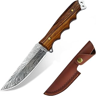 AUBEY Jagdmesser Outdoor mit Scheide Jagdmesser Scharf Feststehende Klinge Überlebensmesser Outdoormesser Bushcraft Messer mit Ledertasche - Camping Messer mit Holzgriff - 440C Stahl Klinge