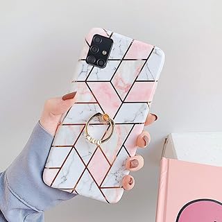 Herbests Kompatibel mit Samsung Galaxy A51 Hülle Bunt Marmor Muster TPU Silikon Handyhülle Glänzend Bling Glitzer Diamant Strass Ring Halter Ständer Ultra Dünn Crystal Schutzhülle,Rosa Weiß