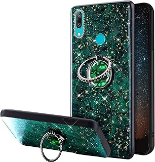 Herbests Kompatibel mit Huawei P30 Hülle Bunt Marmor Muster TPU Silikon Handyhülle Glänzend Bling Glitzer Diamant Strass Ring Halter Ständer Ultra Dünn Crystal Schutzhülle,Gold Grün